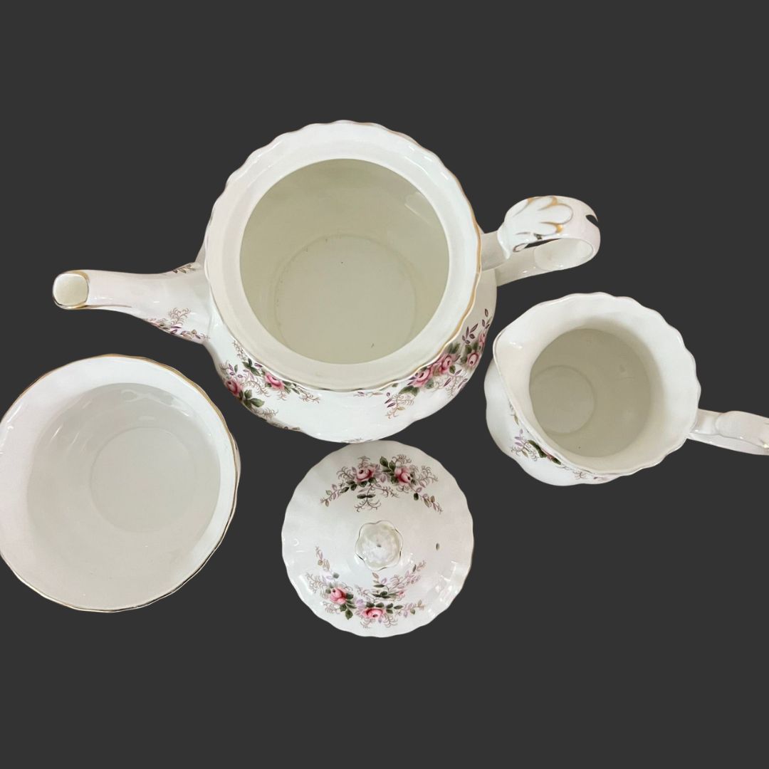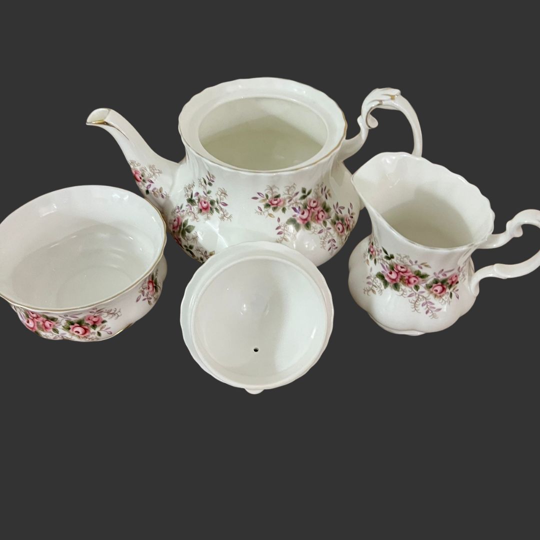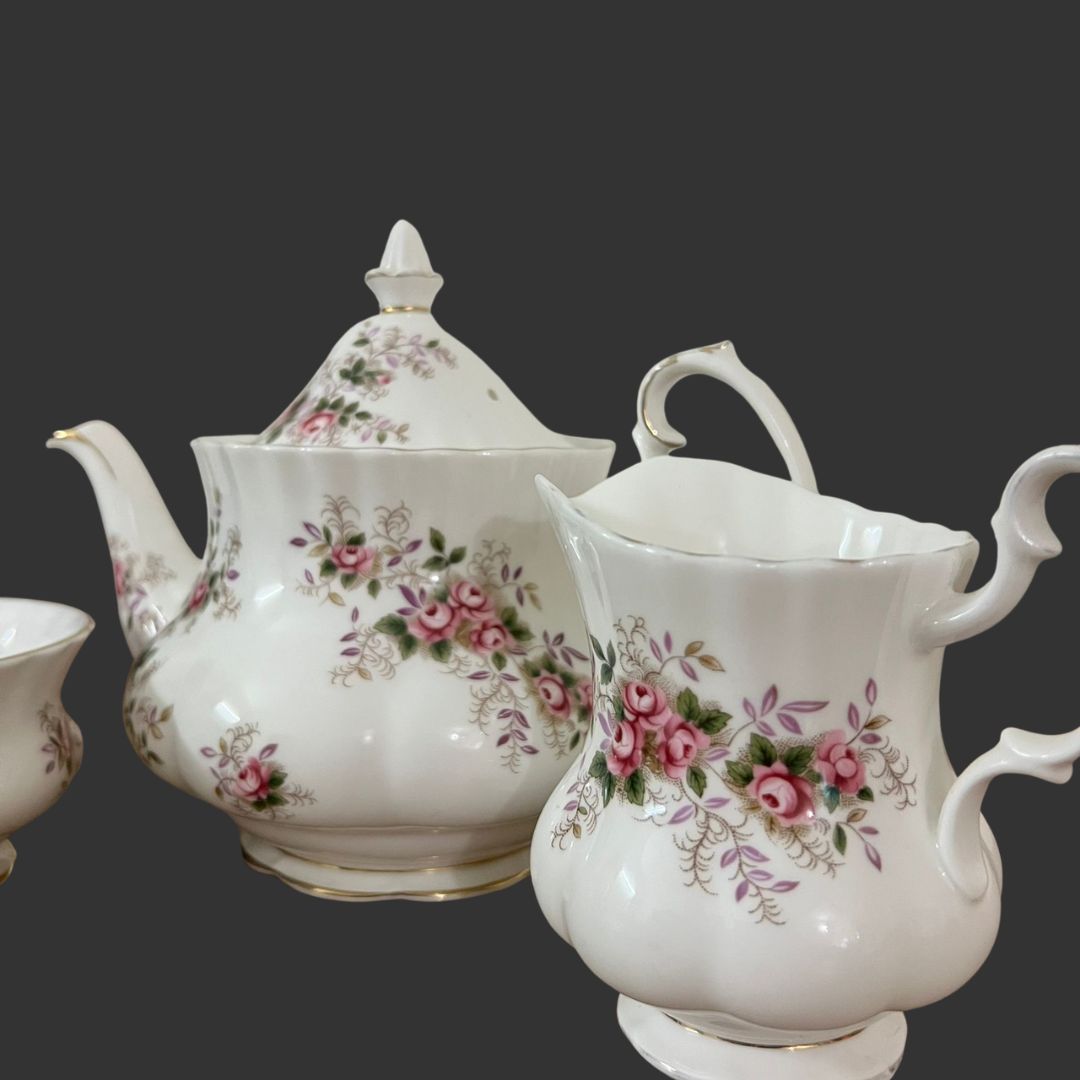 A beautiful Lavender Rose Teapot with matching Sugar bowl and Milk Jug by Royal Albert, English bone china